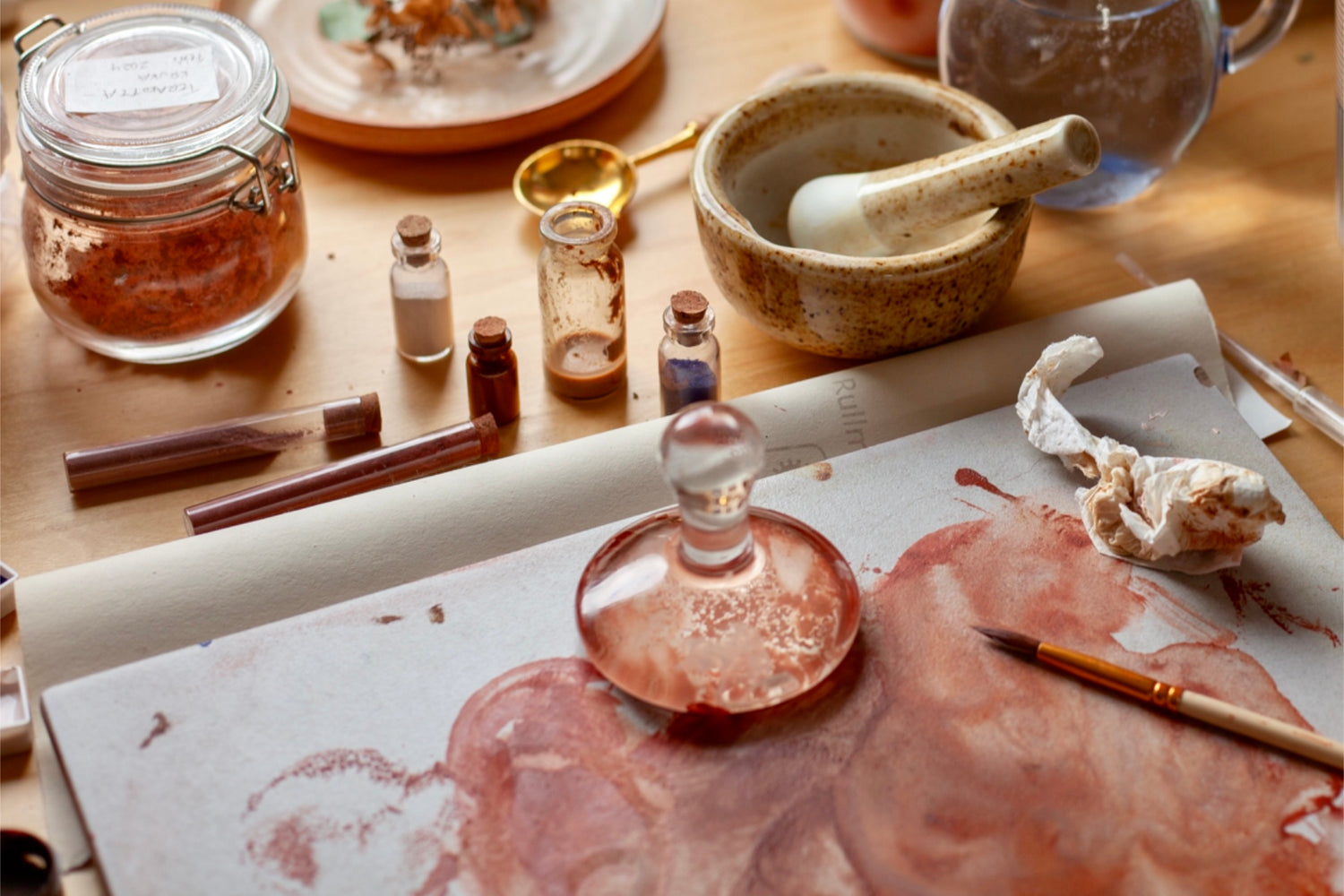 - Pigment: vi går igenom olika sorters pigment; både naturliga och syntetiska, och pratar om hur du kan göra färg av material som finns i naturen.